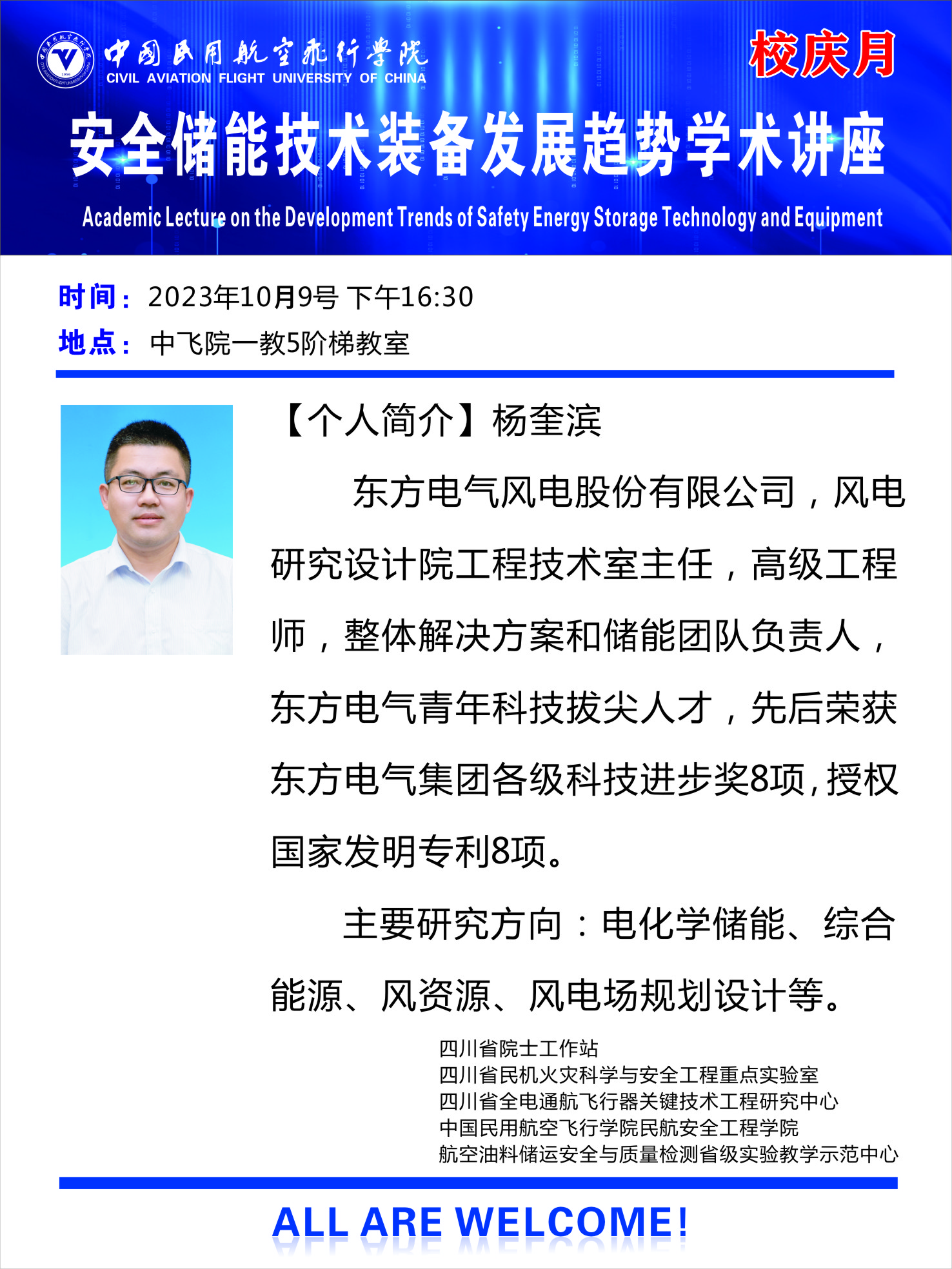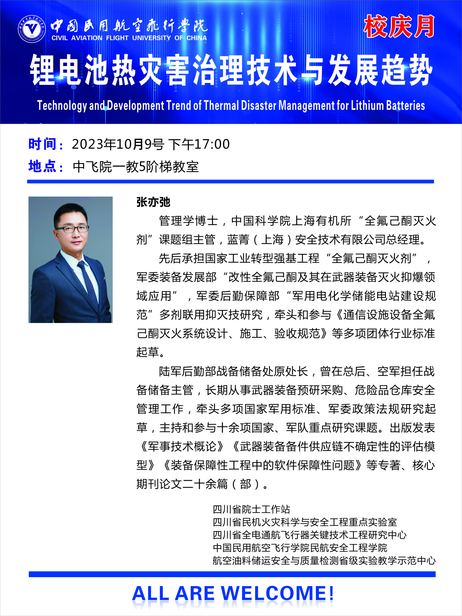 2023年10月9日、10日,为营造良好的科研和学术氛围,庆祝中飞院建院67周年,扩大我校在行业内的科研影响力、提高我校师生的科研素养,安工院特邀请教育部“长江学者”、清华大学“百人引进”特聘教授张辉、蓝菁(上海)安全技术有限公司总经理张亦弛、东方电气风电股份有限公司高级工程师杨奎滨,来伟德官网开展专家主题学术讲座。伟德国际1946源于英国院长贺元骅、副院长何强、教师代表、全体研究生和本科生代表参加了讲座。本次讲座由伟德国际1946源于英国、民机火灾科学与安全工程四川省重点实验室、四川省第十批院士工作站、中国科协学风传承示范基地、四川省全电通航飞行器关键技术工程研究中心等单位共同承办。
