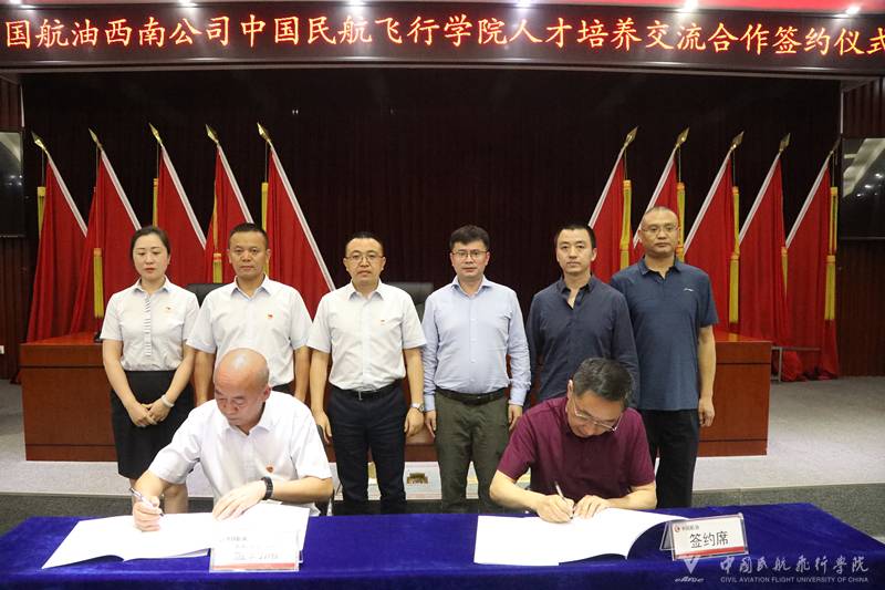 本网讯 杨月新 报道 为进一步贯彻落实新时代民航强国战略,积极落实四川省与中国民用航空飞行学院战略合作重点项目的建设,践行和丰富中飞院与中航油战略合作框架协议内容。6月11日,伟德国际1946源于英国院长贺元骅、中国航空油料集团有限公司西南公司党委委员、纪委书记、工会主席罗成志代表双方单位在中航油西南公司郑重签署了人才培养交流合作协议并为学生实习基地揭牌。四川省教育厅高教处高波莅临指导,伟德国际1946源于英国副书记、纪委书记孔鹏、学院副院长雷秋鸣及中航油西南公司相关人员参加仪式。
