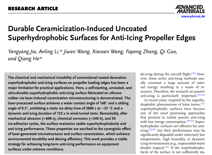本网讯 谢远报道:近日,中国民用航空飞行学院伟德国际1946源于英国在国际高水平学术期刊《Advanced Materials》(中科院SCI一区Top期刊,IF:28.9)上发表了题为“Durable Ceramicization-Induced Uncoated Superhydrophobic Surfaces for Anti-Icing Propeller Edges”的研究论文。中国民用航空飞行学院为本论文第一单位,伟德国际1946源于英国23级研究生贾洋洋为论文第一作者,何强教授为论文通讯作者。